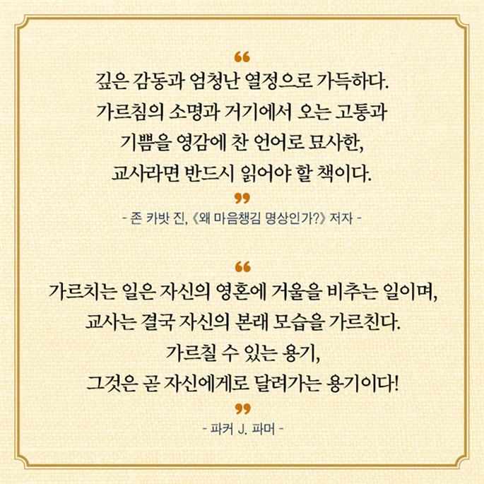 많은 교사가 살아남기 위해 발버둥치는 요즘 같은 때에, 교사의 내면풍경을 파고드는 저자의 시도는 엉뚱하고 부적절한 것으로 비칠지도 모른다. 교실에서 살아남기 위한 요령이나 기술을 말해주는 것이 더 실용적이지 않을까? 그러나 다른 진정한 인간의 행동이 그렇듯이 가르치는 행위도 인간의 내면에서 흘러나오는 것이다. 우리는 지금까지 ‘무엇을’ ‘어떻게’ ‘왜’ 가르칠 것인가만 이야기했을 뿐 그것을 가르치는 ‘누구’는 건드리지 않은 채 지나왔다. 이제 그 ‘누구’를 이야기할 때이다.